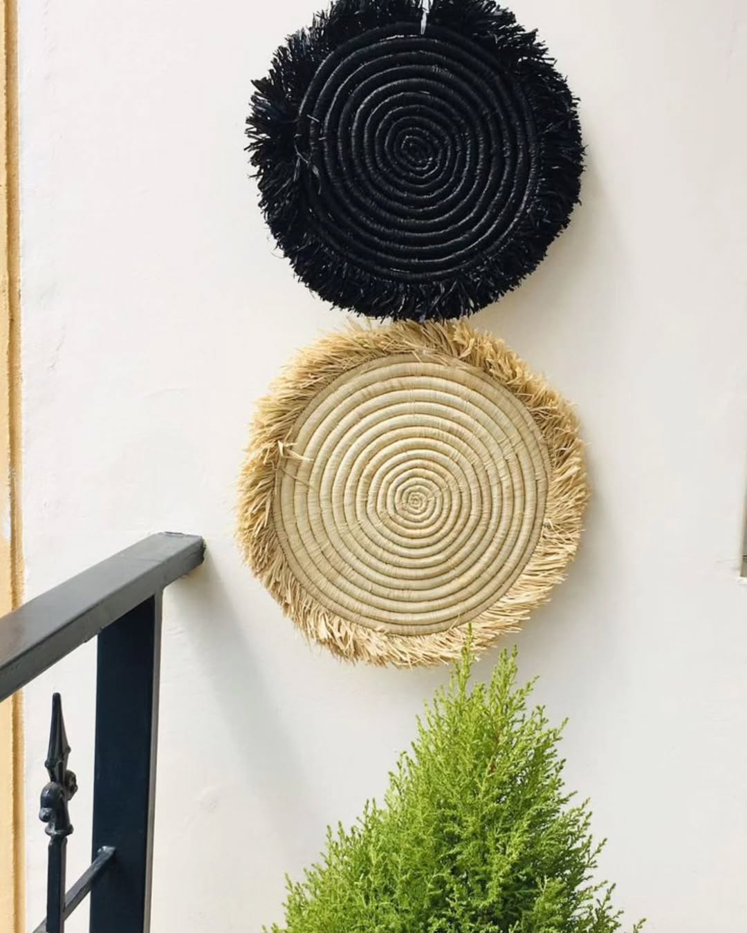 Introducing the Enkito e Ang’ Spirit Pair: two circular woven hangings in black and beige, each edged with soft fringe and centered with a spiral weave. Hung in vertical harmony, they evoke balance and movement—perfect for entryways, sacred corners, or gallery walls. The contrast of tones and textures creates a visual rhythm that speaks to both tradition and modern elegance.