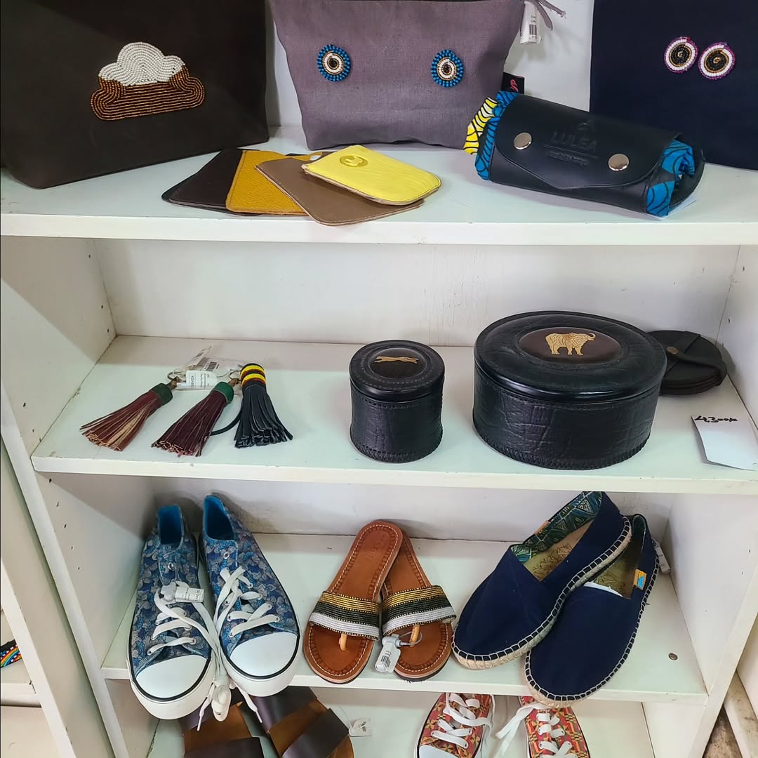 The top shelf, with embroidered eye and cloud pouches, leather swatches, and minimalist wallets, evokes breath, signal, and boutique elevation. The middle shelf, featuring cylindrical leather containers (one embossed with a dog), tassels, and keychains, affirms rhythm, guardianship, and terrain mapping. The bottom shelf, with blue patterned high-top sneakers, fur-lined brown sandals, blue espadrilles, and red-white sneakers, mirrors movement, convergence, and ancestral tactility. The ensemble is framed by natural textures and boutique clarity.
