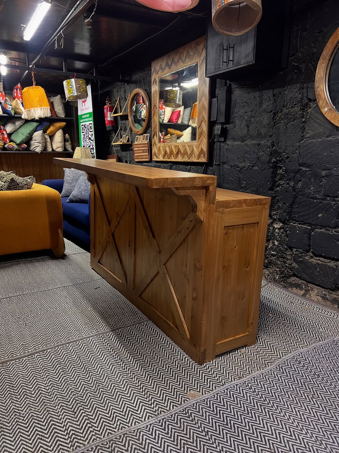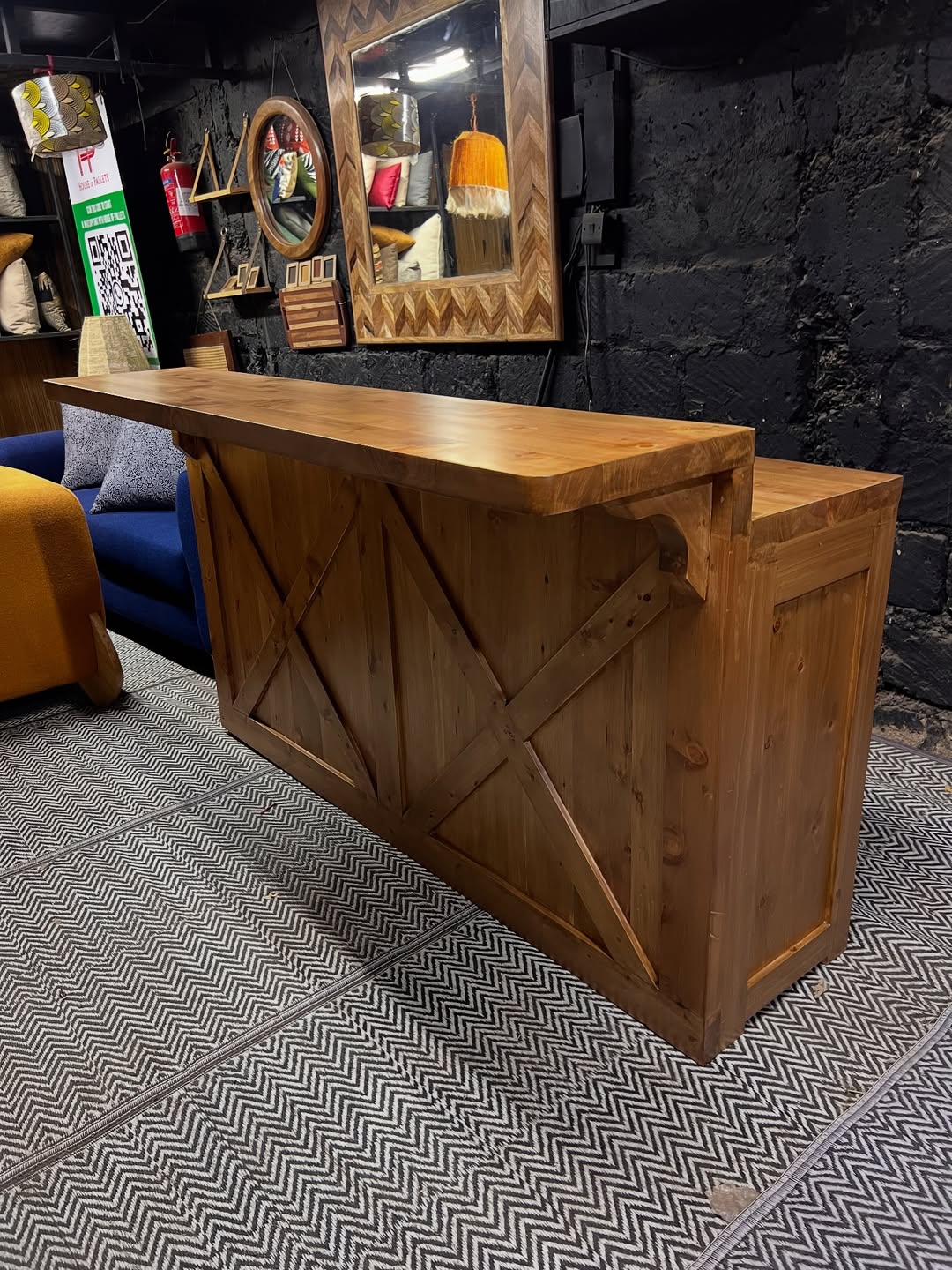 Crafted in natural wood with visible grain and knots, the bar features a thick top surface supported by angled brackets and a bold X-brace front—evoking architectural grounding, hearth rhythm, and sculptural clarity. The surrounding space, with stone walls and layered furnishings, mirrors ancestral texture and hosting flow.
