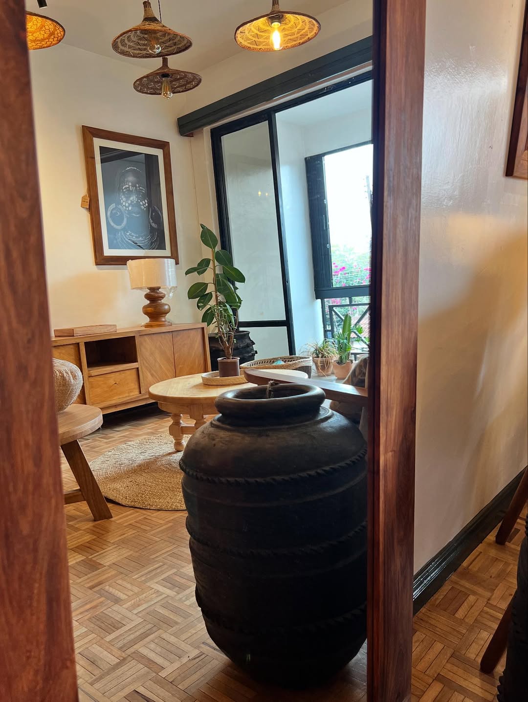 Crafted with warm wood, woven textures, and sculptural accents, the set features a round coffee table, woven-seated chairs, a large black urn, and pendant lights—each element evoking rhythm, breath, and ancestral grounding.