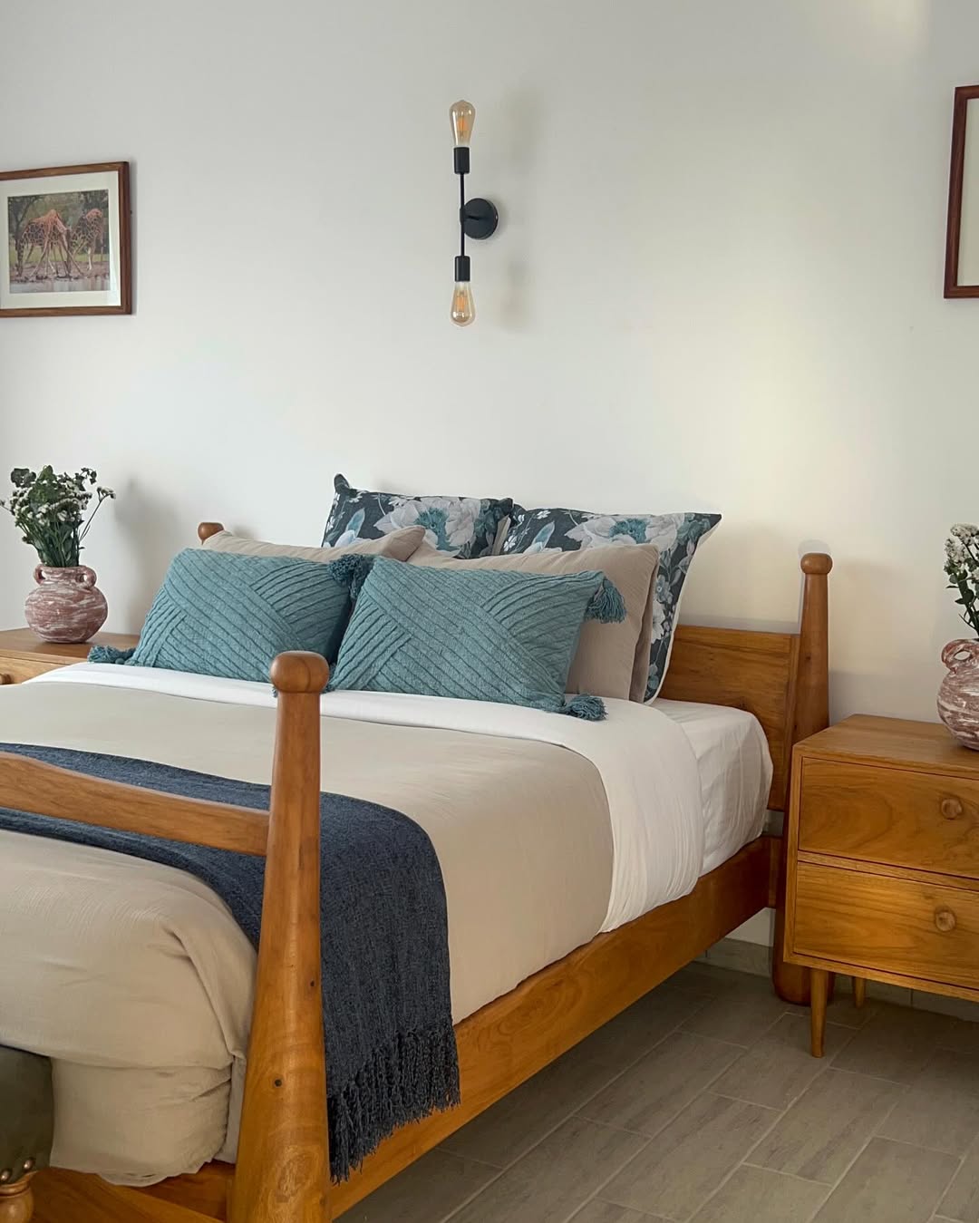 Crafted with warm wood, botanical accents, and floral softness, the set features a wooden bed frame, matching nightstands, teal and floral pillows, and minimalist lighting that invites quietude and grounding.