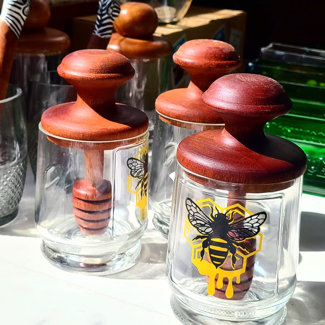 The glass jars, each crowned with a wooden lid and twine loop, evoke breath, containment, and ceremonial purity. Inside, honey dippers affirm offering, movement, and terrain sweetness. Bee-themed stickers, with black-yellow stripes and honeycomb motifs, mirror rhythm, bloom, and ancestral guardianship. Sunlight and white surface framing add boutique softness and elemental elevation.