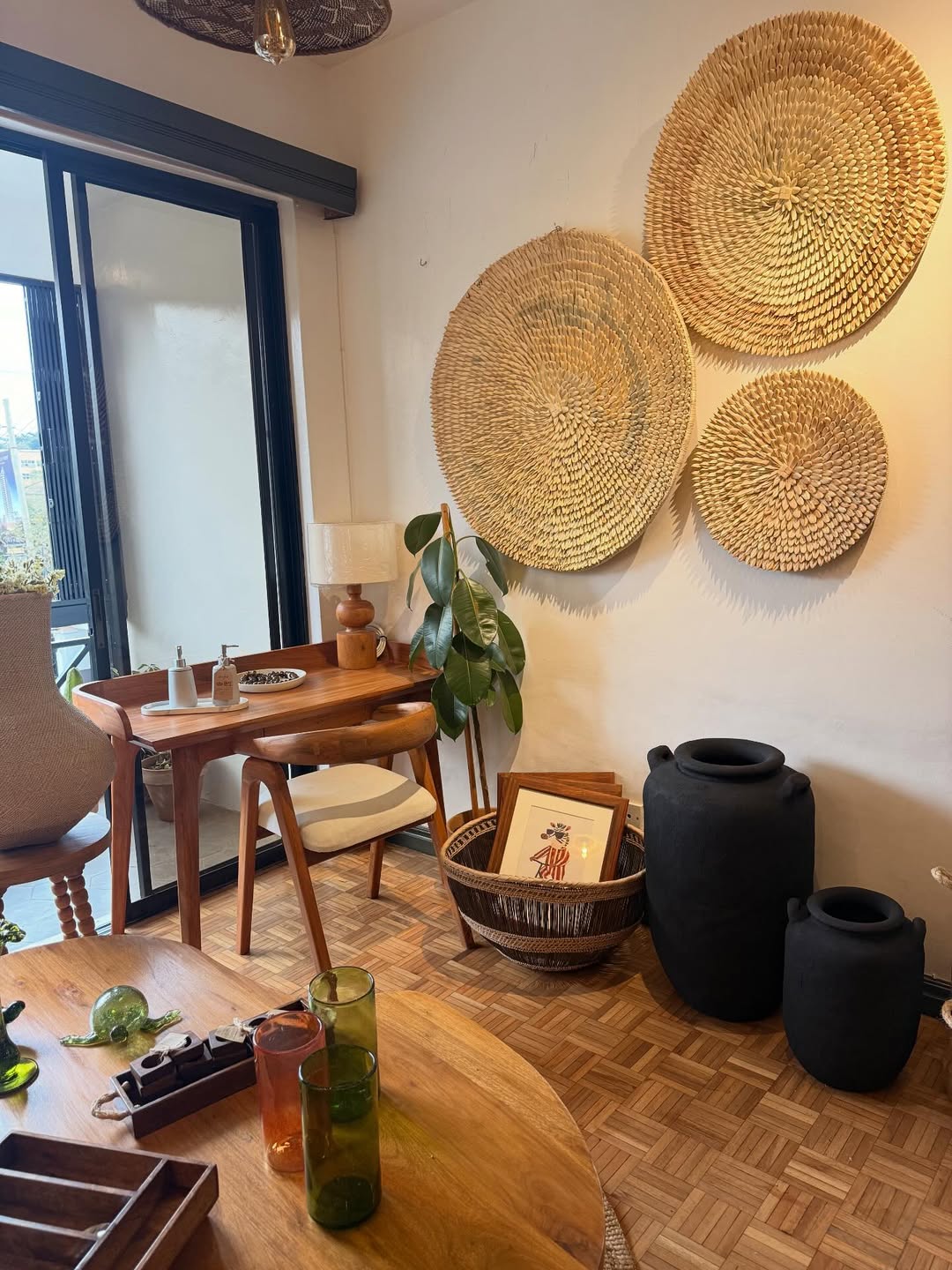 Crafted with woven textures, elemental vessels, and botanical accents, the space features a wooden desk with circular wall hangings, black ceramic pots, a woven basket of framed art, and a coffee table adorned with green and amber glassware—each element evoking rhythm, breath, and ancestral presence.
