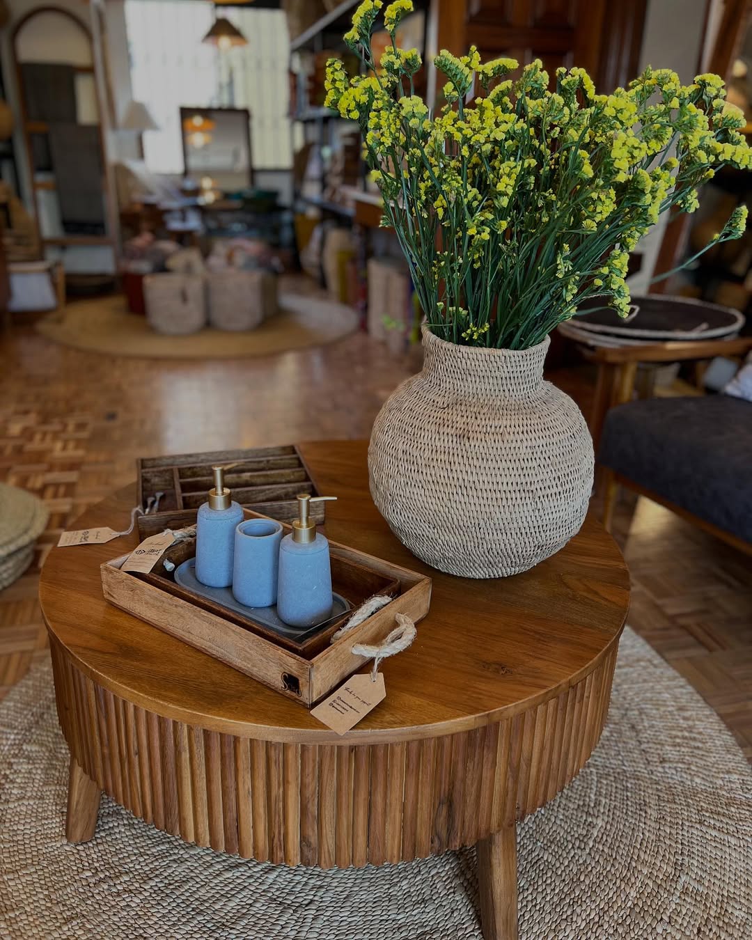 Crafted with fluted wood, woven textures, and botanical accents, the set features a round pedestal table, a woven gourd vase with yellow herbs, and a rope-handled tray with blue ceramic dispensers—each element evoking ritual containment and visual rhythm.