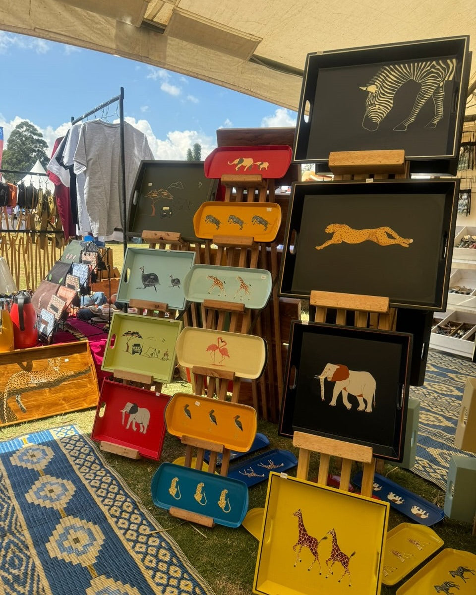 Crafted in bold hues and adorned with stylized wildlife illustrations, each tray evokes movement, breath, and terrain mastery. The animals—zebra, cheetah, elephant, giraffe, flamingo, and bird—mirror spiritual mapping, seasonal flow, and ancestral clarity.