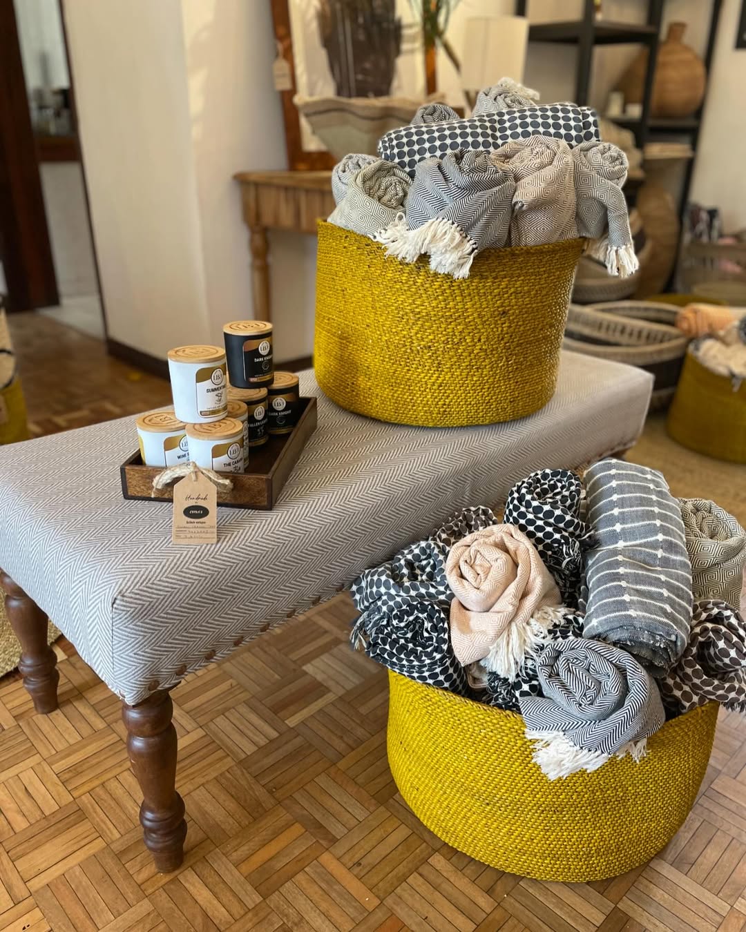 Handwoven by Maasai women’s cooperatives in Kenya, the bright yellow baskets bring a burst of sunshine to any space, while the rolled textiles offer layers of warmth and visual harmony. The cushioned bench and artisan tray complete the set with elegance and practicality.