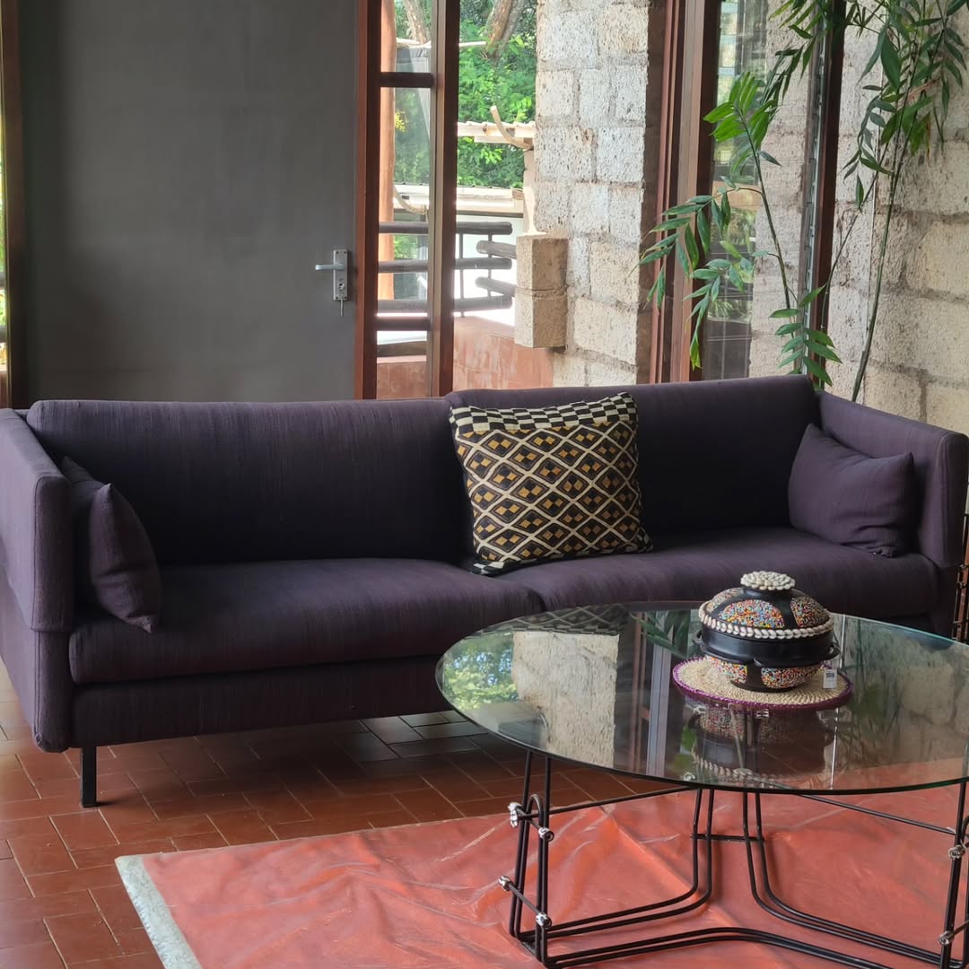 The dark purple sofa, set against stone walls and framed by natural light, evokes breath, grounding, and boutique elevation. The geometric pillow, in black, white, and gold, affirms rhythm, signal, and terrain mapping. The round glass coffee table, with a black metal frame, mirrors movement, clarity, and ancestral tactility. The painted containers, placed on a woven mat, suggest hosting, bloom, and ritual readiness. Terracotta tiles, pink-orange rug, and visible greenery add elemental tactility, softness, and terrain convergence.
