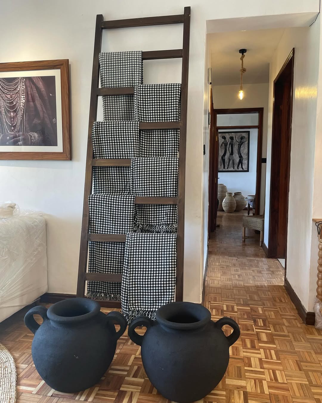 Handcrafted by Maasai artisans in Kenya, the black ceramic vessels with triple handles evoke sacred containers used in ceremonies and storytelling. The ladder rack displays six checkered textiles reminiscent of Maasai shúkà patterns, symbolizing protection, movement, and layered identity.