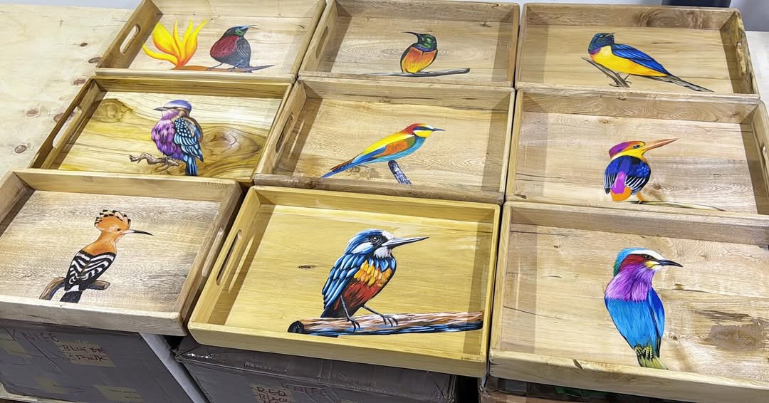 9 Wooden Trays with Unique Hand-Painted Bird Illustrations