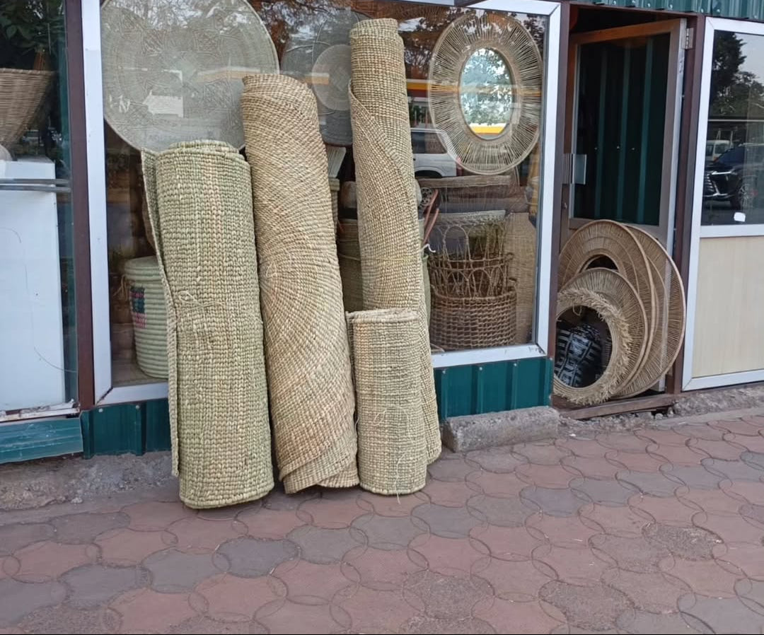 Handwoven by cooperatives in Nyeri, Kenya, the mats are crafted from sisal and baobab fiber using coiling and flat-weave techniques. The baskets and circular hangings reflect Maasai shield symbolism and sacred geometry. The green and white storefront adds elemental contrast and visibility, anchoring the scene in cultural storytelling.