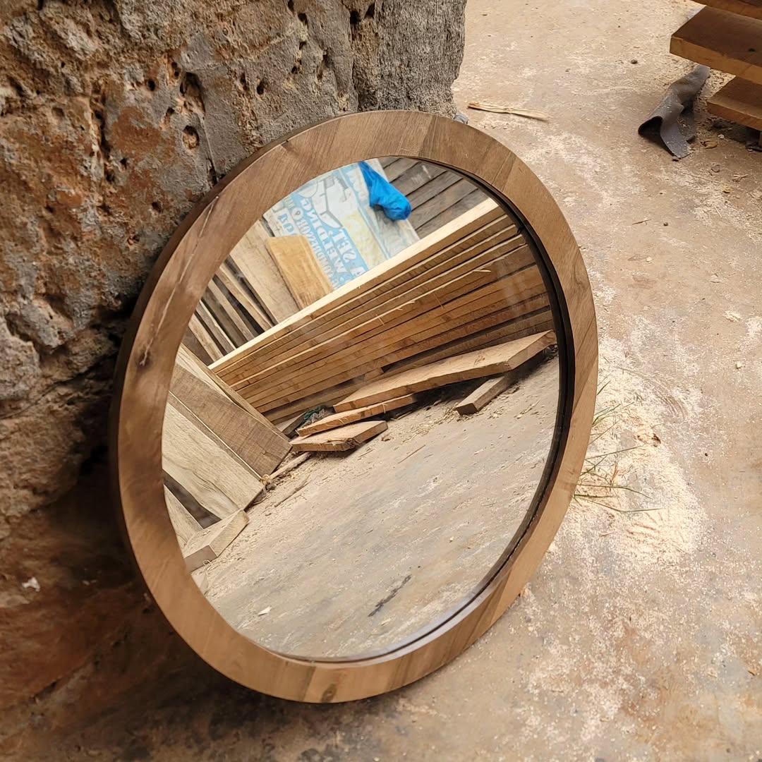 Crafted with a round wooden frame in natural finish, the mirror evokes unity, softness, and sculptural clarity. Its placement against a rugged stone wall and reflection of workshop materials affirms its role as a keeper of space, story, and ancestral rhythm—where reality and ritual meet.